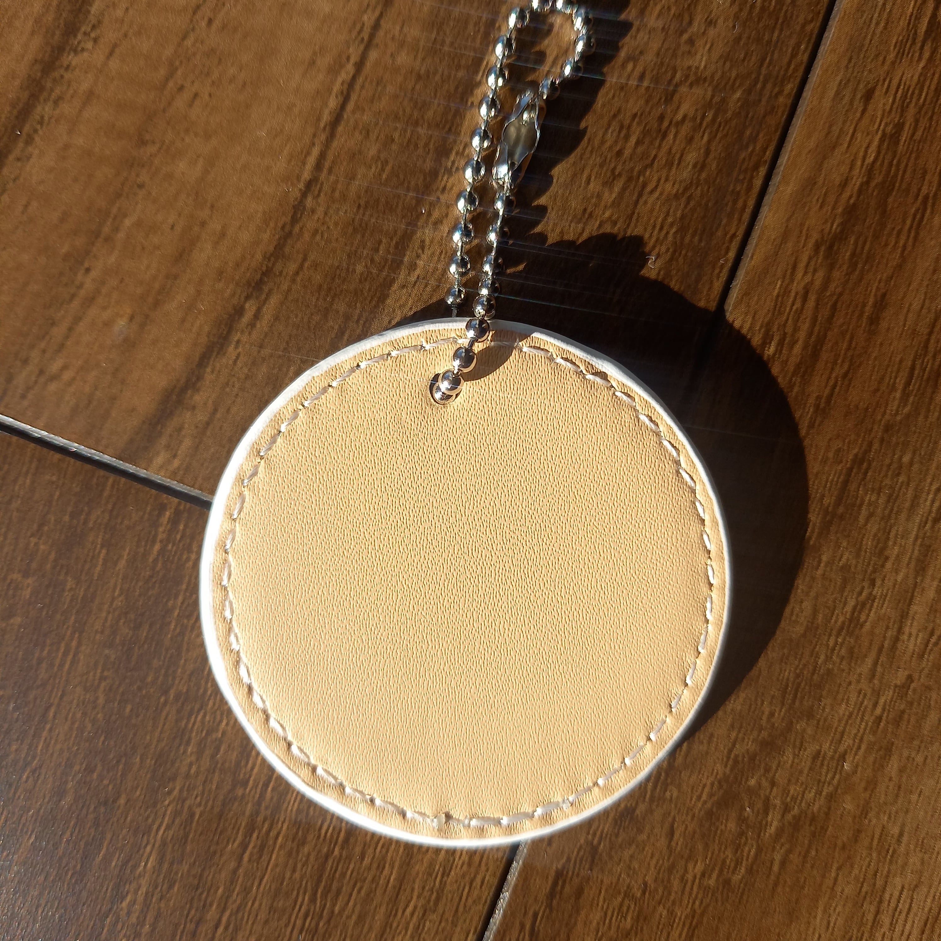 傷や汚れに強いレザー合皮を使用し、柔らかい触り心地が特徴の「円形キーホルダー」。